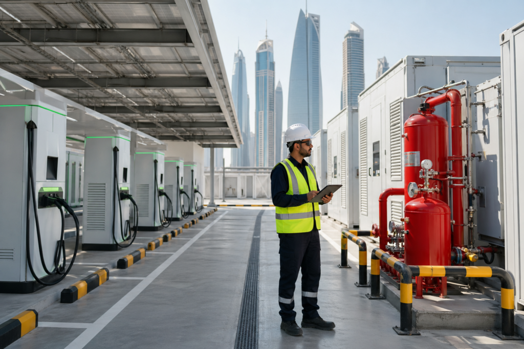 EV Charging Infrastructure. UAE has committed to 50% electric vehicle adoption by 2030. EV charging depots, public charging facilities, and electric fleet garages all present concentrated lithium-ion fire risk.